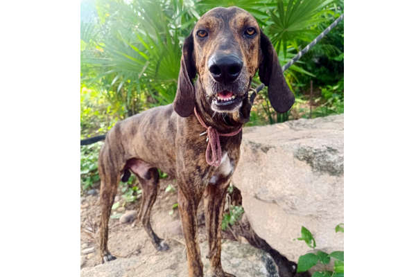 Sabueso es un galán de pelaje atigrado, con tonos que parecen dibujados por la naturaleza misma. Sus orejas grandes y oscuras cuelgan a los lados de su rostro como cortinas suaves que enmarcan su mirada noble. La naricita negra le da un toque elegante, y una manchita blanca en el pecho parece una medalla de ternura que lo distingue. Tiene porte, tiene estilo… y está listo para conquistar corazones.