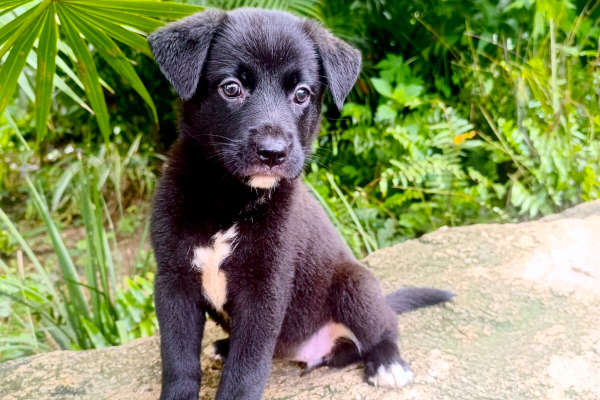 Koda es una perrita de pelaje negro brillante con detalles que la hacen única. En la punta de algunos deditos lleva toques blancos, como si hubiera caminado sobre estrellas, y en la barbilla asoma una manchita blanca que le da un aire dulce y sabio. En el pecho luce una mancha blanca que parece una insignia de ternura, y su naricita negra completa su expresión encantadora. Koda es discreta pero especial, lista para llenar tu vida de compañía y cariño.