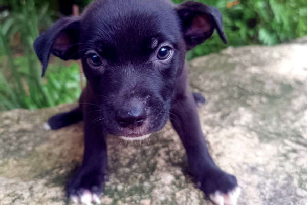 Kenai es un perrito de pelaje completamente negro, elegante y brillante como noche estrellada. En la punta de algunos deditos lleva toques blancos que parecen salpicaduras de luz, y en la barbilla asoma una manchita blanca que le da un aire sabio y encantador. Su naricita negra completa su expresión dulce y serena. Kenai es discreto pero especial, un compañero fiel que espera con paciencia a quien sepa ver su magia.