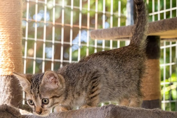 Tati es una gatita tabby gris con delicados toques cálidos color café que le dan un brillo especial, como si el sol hubiera acariciado su pelaje. Sus ojos verde-oliva reflejan curiosidad y ternura, y su naricita rosa le da un toque suave y encantador. Tiene una expresión tranquila y observadora, como si siempre estuviera descubriendo algo nuevo. Tati es una pequeña exploradora felina, lista para llenar tu hogar de calma y cariño.