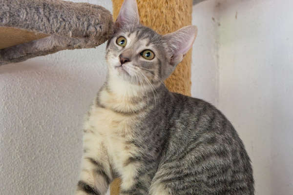 Eva is a gray tabby kitten with a smoky-soft coat that looks like it was painted with gentle strokes. Her rosy nose adds a playful charm, and her olive-green eyes shimmer with sweetness and curiosity. She arrived at CCSA with her siblings Edén, Emilia, Eric, Eli and Enzo, forming a bundle of heart-melting cuteness. Eva is the perfect blend of feline grace and mischievous spirit—ready to bring love and joy into your life!