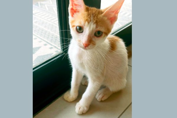 Rosco is a white kitten with soft streaks of orange tabby on the top of his head, ears, back, and tail—like little sunbeams brushed across his fur. His pink nose and gray eyes give him a sweet, curious look, as if he's always plotting his next playful move. Rosco is the perfect blend of charm and mischief, ready to fill your home with purrs and joy.