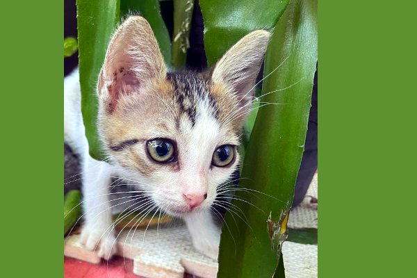 Rosie is a white kitten with soft gray tabby markings on her head and back, like gentle brushstrokes of shadow. Warm brown touches peek through, adding a cozy, elegant flair. Her pink nose and olive-green eyes give her a sweet, thoughtful expression, as if she’s quietly observing the world with calm curiosity. Rosie is a little feline masterpiece, ready to fill your home with love and charm.