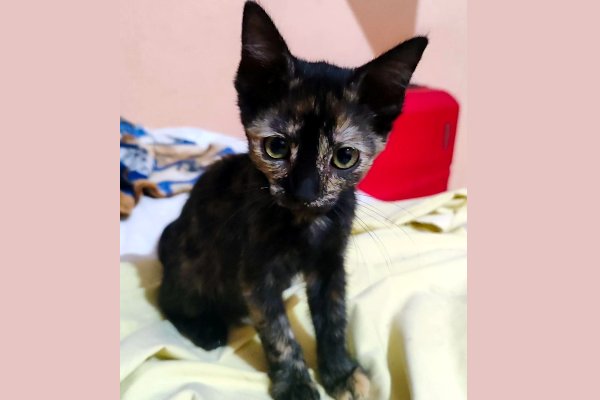 Ruby is a tortoiseshell kitten, mostly black with soft orange streaks that flicker across her fur like gentle flames. Around her eyes, delicate gray brushstrokes add a touch of mystery and grace. Her green eyes sparkle like curious emeralds, and her black nose gives her face a bold, charming finish. Ruby is a feline masterpiece—ready to bring a little magic, sweetness, and purring charm into your life.