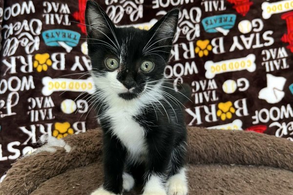 Silvestre is a tuxedo kitten with the flair of a feline fashion icon. His coat is mostly sleek black, but his four white paws look like he's wearing tiny gloves, and the crisp white stripe across his neck and chest resembles a formal tie. His snout is split in perfect contrast—half black, half white—with a black nose right in the center. His green eyes sparkle with mischief, and his white whiskers pop like strokes of light. Silvestre is charm and elegance wrapped in a playful little package, ready to steal your heart.
