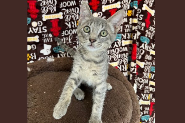 Zazu is a gray tabby kitten with a charming look and a gaze that draws you in. His soft, ash-toned stripes flow gracefully across his body, giving him a classic feline elegance. His reddish nose pops like a playful little button on his curious face, and his olive-green eyes shine with both sweetness and smarts. Zazu is lively, expressive, and full of heart—the perfect companion for anyone looking for a cat with character and soul.