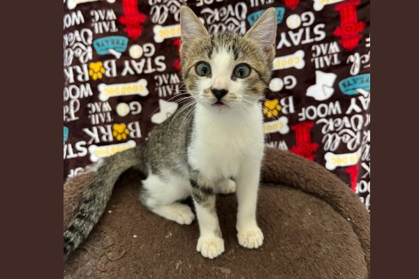 Zully looks like she was lovingly brushed into life by nature’s hand. Her chest, neck, and paws are snowy white, while her back and tail wear classic gray tabby stripes that ripple like feline whispers. Her head blends gray with warm hints of brown, and her white snout frames a black nose shaped like a tiny heart—a detail that melts hearts. Her olive-green eyes sparkle with curiosity and sweetness. Zully is gentle yet full of character, ready to fill your home with purrs and affection.