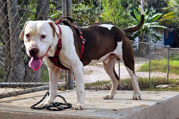 ¡Conozcan a Chato! Este guapísimo pitbull es una obra de arte con su pelaje blanco inmaculado, salpicado de manchas café oscuro que le dan un toque único en el lomo y los muslos traseros. ¡Y chequen su cola! Es oscura con la punta blanca, como si la hubiera mojado en pintura. Su nariz es de un lindo tono café y sus patitas son tan blancas que parecen recién salidas del spa. Chato es un amor, listo para llenar de alegría y lametones su nuevo hogar.