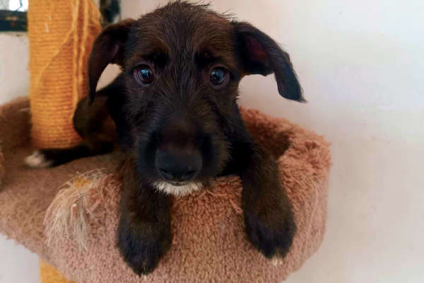 Cronos es un perrito con estilo rebelde y mirada encantadora. Su pelaje negro de alambre le da ese toque desaliñado que lo hace irresistible, como si siempre estuviera listo para una aventura entre hojas y caricias. En la barbilla lleva una pequeña manchita blanca que parece una firma de ternura, y en las patas traseras, las puntas de sus deditos blancos asoman como si llevara calcetines diminutos. Cronos es personalidad pura en cuerpo peludo.