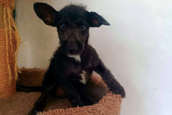 Minerva es una perrita con look de exploradora y corazón de peluche. Su pelaje negro de alambre le da un estilo único, como si siempre estuviera lista para una caminata entre hojas y abrazos. Desde la barbilla hasta el cuello, una delicada manchita blanca parece dibujada con pincel, y en el pecho, una rayita blanca completa su diseño encantador. Su naricita negra, siempre curiosa, no deja pasar ni una caricia. Minerva es ternura con textura, lista para encontrar su familia ideal.